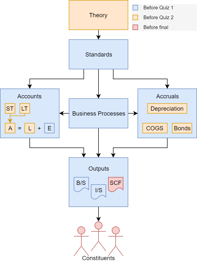 \[ \begin{align} Assets &= Liabilities + Equity \\ \\ Equity &= Shares + Retained~Earnings - Dividends + Revenues - Expenses \end{align} \]
