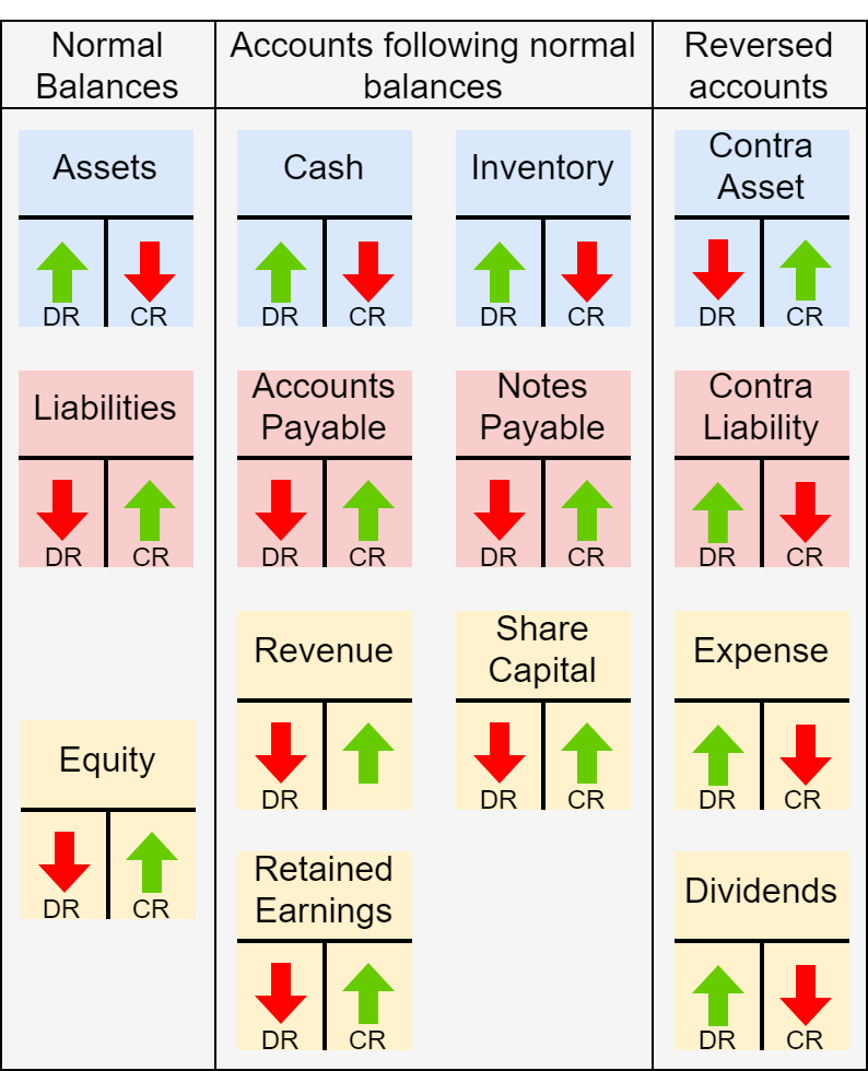Type Asset (↑=DR) Liability (↑=CR) Expense (↑=DR) Revenue (↑=CR)