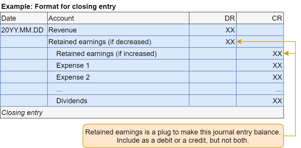 • Debit Revenue, Credit Retained earnings